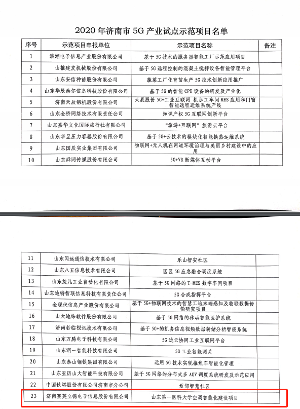 热烈祝贺济南赛英立德智能控制项目“山东第一医科大学空调集控系统”入选山东省济南市“济南市2020年5G产业试点示范项目”试点示范企业和项目!